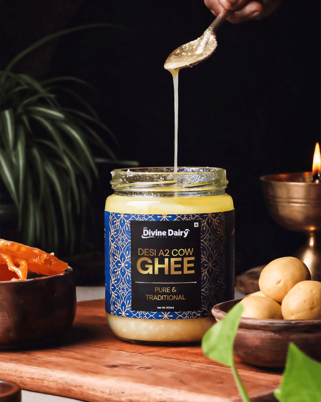 Work spanned the complete brand system — logo refinement, business card design, brand guidelines, product packaging (ghee jars, flavoured curd containers, A2 product range), and social media campaigns. Hero campaign lines like "Made to Devour," "Love Every Bite," and "Purity You Can Trust" were translated into scroll-stopping visuals that made the product impossible to ignore.