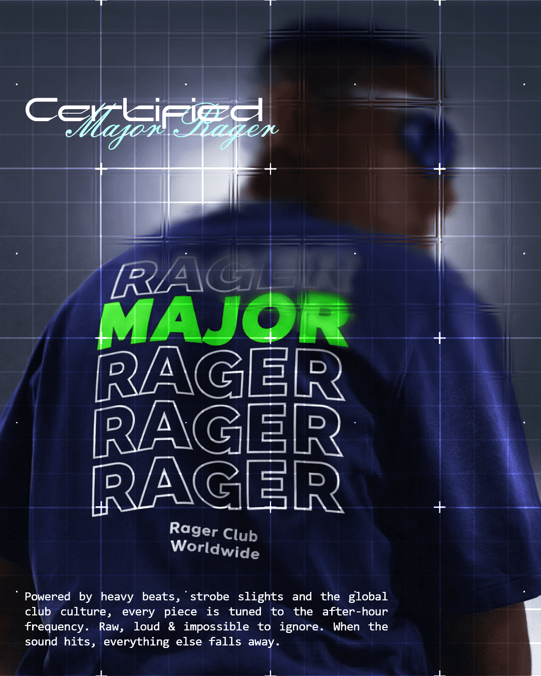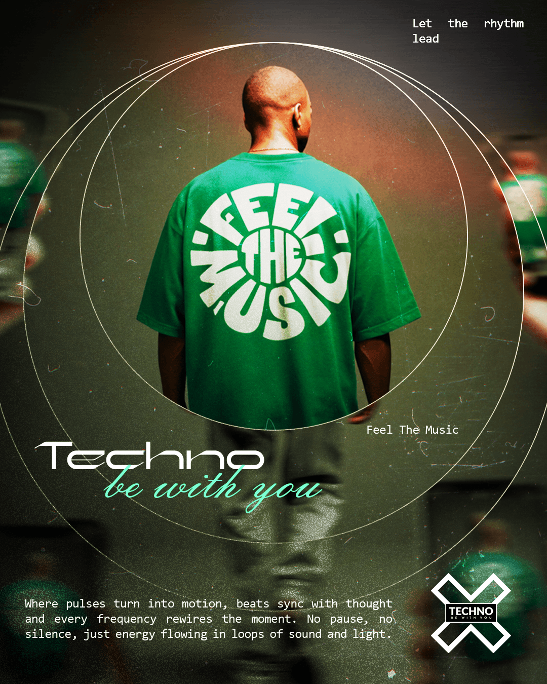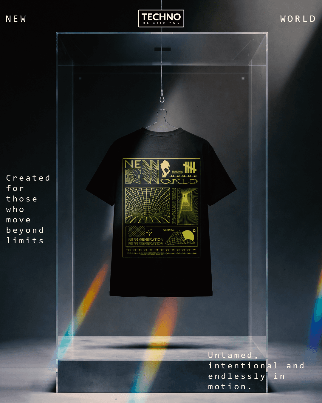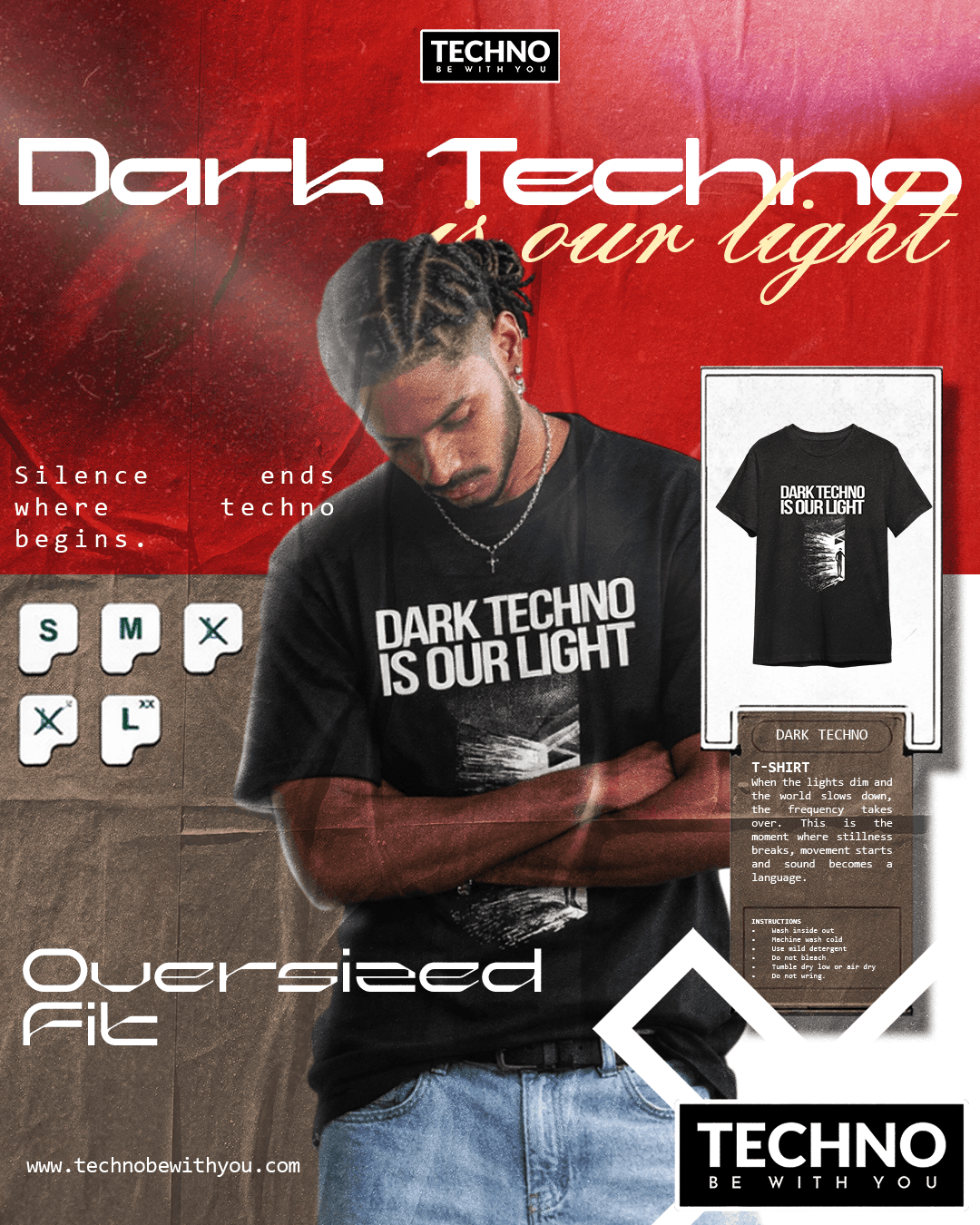 Every design decision was intentional — dark backgrounds that echo warehouse lighting, oversized type that hits like a drop, and imagery that puts the wearer at the center of a movement. From the "Dark Techno Is Our Light" editorial to the "Wild & Free" campaign and the "Too Futuristic to Fade" series, each visual was crafted to feel less like clothing and more like a statement.